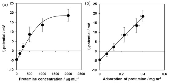 Zeta potential properties of protamine-adsorbed HAp powders. Zeta potential of protamine/HAp powders were measured (a). Adsorption of protamine and its zeta potential were related to a positive correlation (b). Each value represents the mean of triplicate tests. Error bars indicate the standard error of the mean.