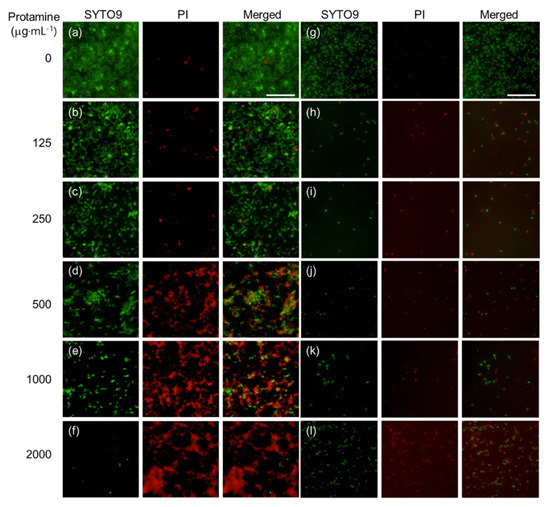 LIVE/DEAD staining of bacteria on the surface of protamine/HAp discs. Escherichia coli (a–f) and Staphylococcus aureus (g–l) were cultured on various concentrations of protamine/HAp discs: (a,g) 0 (HAp), (b,h) 125, (c,i) 250, (d,j) 500, (e,k) 1000, and (f,l) 2000 μg∙mL−1 for 24 h. Cells were stained using the LIVE/DEAD Bacterial Viability kit, as described in Materials and Methods, and observed by fluorescence microscopy (live/dead = green/red, respectively). Bars indicate 20 μm.