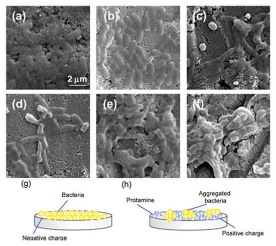 SEM images of E. coli cells on the surface of protamine/HAp discs. E. coli cells cultured on various concentrations of protamine/HAp discs: (a) 0 (HAp), (b) 125, (c) 250, (d) 500, (e) 1000, and (f) 2000 μg∙mL−1 for 24 h were observed by SEM. Bar indicates 2 μm. Schematic diagram of the adhesion of bacteria to HAp (g) or protamine/HAp disc (h).