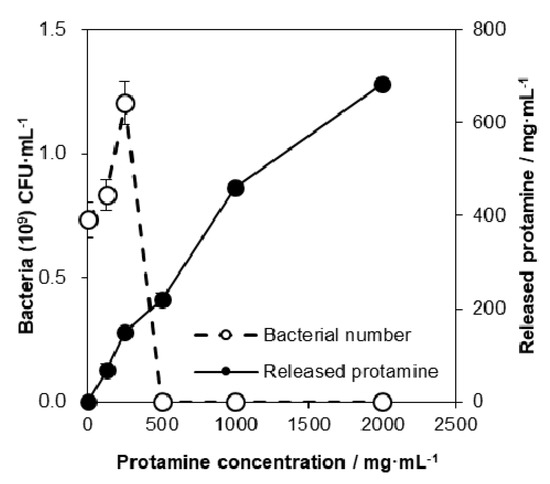 Next, to clarify the mechanism of antimicrobial properties of protamine/HAp on E. coli, the concentration of the protamine released into the LB medium was measured. It was found that the concentration of protamine in the LB that was released from the discs increased with increasing amounts of adsorbed protamine (Figure 5, solid circles: -●-). However, the protamine released from all discs was approximately 7–10% of the total adsorbed amount of protamine. The amount of the bacteria in the LB medium was affected by the protamine concentration (open circles: -○-). A low concentration of protamine (~250 μg·mL−1) induced cell aggregation and led to an increase in the number of bacteria. By contrast, a high dosage of protamine (over 500 μg·mL−1) induced cell death. These data indicate that the bactericidal ability of protamine/HAp discs was mainly due to the release of protamine from HAp. Interestingly, the release of protamine from discs only occurred in the ion-rich media such as the LB medium and simulated body fluid. Analysis of the ion concentration in the LB medium showed that the concentration of sodium ions in LB decreased due to the release of protamine (data not shown). These results suggest that the adsorbed protamine was released through ion exchange.