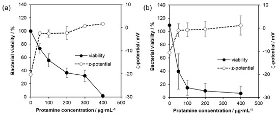 The bacterial viability and zeta potential of bacteria by treatment of protamine. E. coli (a) and S. aureus (b) were treated with protamine for 18 h. Various concentrations of protamine were tested. Solid circles (-●-) indicate the % of viable bacterial cells by treatments of protamine, while the zeta potential is represented by the open circles (-○-). Each value represents the mean of triplicate tests. Error bars indicate the standard error of the mean.