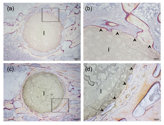 Furthermore, to evaluate the biocompatibility of the protamine/HAp (0 vs. 1000 μg·mL−1) in vivo, the specimens (diameter: 4 mm, height: 8 mm) were implanted into the tibiae of Japanese rabbits for eight weeks (Figure 8). Histological observation by Villanueva bone staining showed that the newly formed bones were directly in contact with both HAp and protamine/HAp discs without fibrous tissues (shown by arrowheads in Figure 8b,d). It was concluded that HAp and protamine/HAp discs were compatible with the rabbit tibia and that no degradation of the implant material occurred at the intervals of up to eight weeks after the implantation. No significant difference was found between the biological behavior of the discs prepared using HAp only and the discs prepared using the protamine/HAp powders. Taken together, these results demonstrate that the protamine/HAp powders (by the concentration at 500 μg·mL−1) were both osteoconductive and biocompatible in vitro and in vivo.