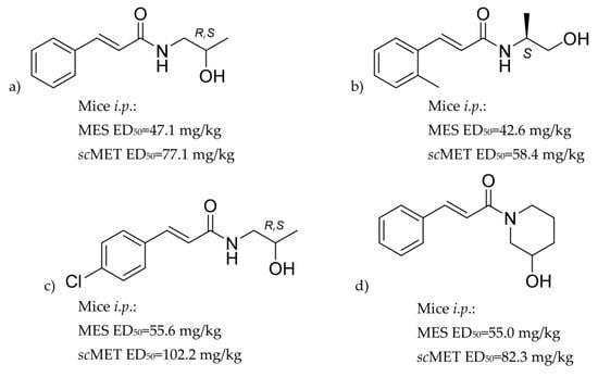 Searching for new anticonvulsant and antiepileptic agents constitutes an important issue within modern medicinal chemistry. Despite availability of about 30 antiseizure drugs on the market, it is estimated that about 30% of seizures still remain resistant to pharmacotherapy []. Cinnamic acid derivatives, including those possessing amide moiety i.e., cinnamamide derivatives, have been recognized as important drug candidates for various neurological disorders including epilepsy [,]. Two significant examples of cinnamamide derivatives are antiepilepsirine and cinromide. Antiepilepsirine, primarily synthesized as a derivative of naturally occurring compound—piperine, was marketed as an antiepileptic drug [], while cinromide entered clinical trials for the treatment of the Lennox–Gastaut syndrome []. Several other cinnamamide derivatives were tested in animal models of seizures and have been reported for several decades as potential drug candidates for epilepsy [,].