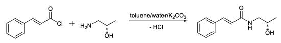 Synthesis of the tested compound KM-568 was carried out according to scheme presented in Figure 3. In the reaction, 0.015 mole of S-2-aminopropan-1-ol was dissolved in 50 mL 5.5% solution of K2CO3. Then, 10 mL toluene was added and the solution of 0.015 mole of E-cinnamoyl chloride in 30 mL of toluene was added dropwise while the reaction mixture was mixed on magnetic stirrer. The crude product obtained in the reaction was filtered and washed with 20 mL of 5% K2CO3 and 50 mL of distilled water. The compound was dried and crystallized with a mixture of n-hexane and toluene (3:1 v/v).