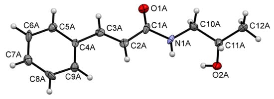 In Figure 4, the molecular conformation of the investigated compound in the crystal with the atom numbering scheme for molecule A is shown. This compound crystallizes with eight molecules in the asymmetric unit and the molecules are marked as A, B, C, D, E, F, G and H. The crystal structure confirms the assignment of the E isomer (double bond C2=C3) in all eight molecules. Likewise, all molecules possess S configuration at the chiral carbon atom C11. 3-Phenylprop-2-enamide moiety is almost planar with the values of interplanar angle between the plane of aromatic ring and the plane of amide group being 9.9(8), 16.5(7), 16.6(7), 16.3(6), 18.6(7), 11.1(8), 16.9(6) and 15.3(6)°, for molecules A, B, C, D, E, F, G and H, respectively. We have observed similar values earlier in the crystal structures of other cinnamamide derivatives [,,,]. It is worth notingthat this angle for determined crystal structure of racemic mixture of KM-568 has value 18.7(1)° [].