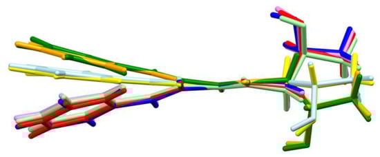 The overlap of amide groups of eight molecules: A yellow, B orange, C red, D light green, E green, F light blue, G blue and H violet.