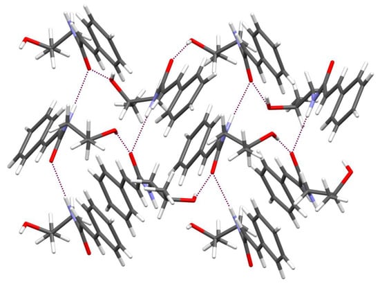 From a topological point of view, there are two groups (N-H and O-H) as donors of hydrogen atoms and one as an acceptor (C=O), which can generate intermolecular hydrogen bonds. The packing of molecules is determined by N-H···O and O-H···O intermolecular hydrogen bonds (Figure 6). These interactions create the (14) and (22) [].