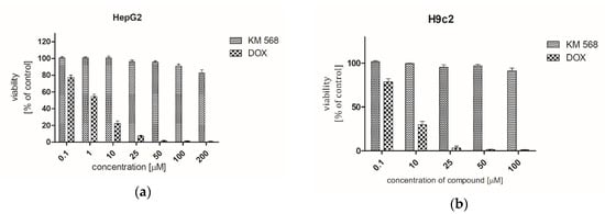 Results of cytotoxicity evaluation of compound KM-568 and doxorubicin (DOX) in (a) HepG2 and (b) H9c2 cell lines in an MTT assay. Results were presented as mean ± SD from three samples.