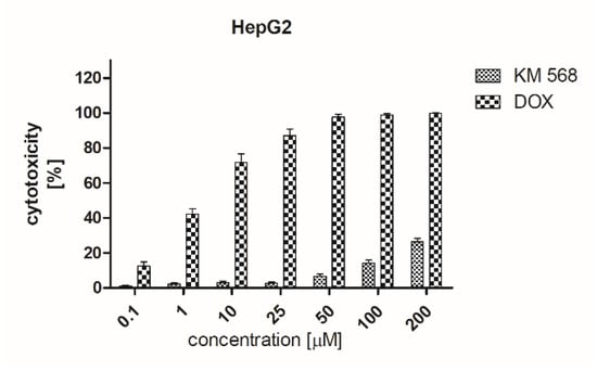 Results of cytotoxicity evaluation of compound KM-568 and doxorubicin (DOX) in an HepG2 cell line in an LDH assay. Results presented as mean ± SD from three samples.