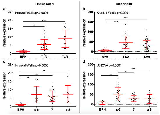 In both cohorts analyzed with qRT-PCR a significant overexpression of SMPDL3B could be seen in tumor samples compared to BPH samples (Tissue scan: 6.46× and Mannheim: 37.81×, Mann–Whitney for both p < 0.001). This was also seen after stratification of tumor samples for T stage (both p < 0.001, Figure 1a,b) and Gleason score (both p < 0.001, Figure 1c,d). In the tissue scan cohort, multiple comparison showed significant overexpression of SMPDL3B in both locally confined (T1/2: 5.42×, p = 0.001) and locally advanced (T3/4: 8.94×, p < 0.001) PCa and in different Gleason groups (≤ 6: 7.01×, p = 0.002; 7: 6.00×, p < 0.001; ≥ 8: 7.14×, p = 0.004) compared to BPH. No significant differences were seen between tumor groups. Similar results were seen in the Mannheim cohort: T1/2 vs. BPH: 46.6× (p < 0.001), T3/4 vs. BPH: 32.37 (p < 0.001), Gleason ≤ 6 vs. BPH: 50.19 (p < 0.001). Controversially, no significant overexpression in Gleason 7 or Gleason ≥ 8 compared to BPH was seen, while the expression was also significantly higher in Gleason ≤ 6 tumors compared to Gleason 7 (p = 0.045) and Gleason ≥ 8 (p = 0.030) tumors. In the Mannheim cohort, SMPDL3B expression did not correlate with the serum PSA level (Spearman r =−0.103, p = 0.453). For the tissue scan cohort, no serum PSA data were available.