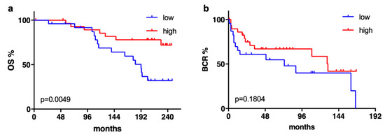 Interestingly, after a 50:50 division of the Mannheim cohort into two groups by SMPDL3B expression, a lower expression of SMPDL3B in tumor samples correlated with a shorter OS (Figure 2a, p = 0.005) in long-term follow-up (average follow-up time: 168 months). Using the same cutoff, no significant difference was seen for BCR (Figure 2b).