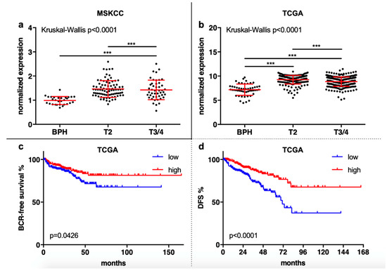 (a) and (b) Both in the Memorial Sloane Kettering Cancer Centre (MSKCC) and in The Cancer Genome Atlas (TCGA) cohort, the expression of SMPDL3B was higher in T2 and in T3/4 tumors compared to BPH. In the TCGA cohort, the expression was also significantly higher in T2 compared to T3/4 tumors. (c) and (d) A low expression of SMPDL3B was associated with a significantly shorter BCR-free survival and progression-free interval (PFI) in the PCa patients from the TCGA cohort. (*** p > 0.001)