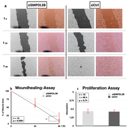 (a) Wound-healing migration assay in PC3 cells after siRNA knockdown of SMPDL3B (n = 16). Images were taken at 0, 24, and 48 h after scratch. Calculation of the wound area was performed using TScratch software® (black and white images), with a percentage of the wound area being given for each image. (b) Quantitative results of the migration assay which showed a significant reduction of the migration of siSMPDL3B-transfected cells compared to siCtrl after 48 h (p = 0.0081). (** p > 0.01) (c) PC3 cell proliferation after siRNA knockdown was not significantly altered after knockdown of SMPDL3B (n = 10, p = 0.74).