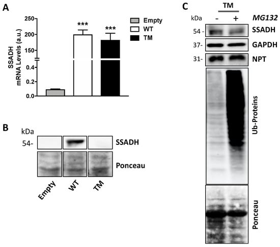 Triple mutant succinate semialdehyde dehydrogenase (TM SSADH) undergoes degradation in U87 cells. U87 cells were transiently transfected for 24 h. (A) RT-qPCR analysis of mRNA levels of ALDH5A1 gene, normalized for both β-Actin and NPT mRNAs. Data are shown as mean ± SD. n = 3, *** p < 0.001; (B) SSADH protein levels in the precipitated protein fraction. Ponceau staining was used as loading control. A total of 20 µg of total protein extract was loaded on each lane; (C) cells were treated with 10 µM MG132 proteasome inhibitor, during transfection, and TM SSADH and ubiquitinated proteins were assessed by Western blot analysis. Glyceraldehyde 3 phosphate dehydrogenase (GAPDH) was used as loading control, NPT for transfection efficiency, Ponceau protein staining as loading control for ubiquitinated proteins. Representative Western blot analyses are shown.