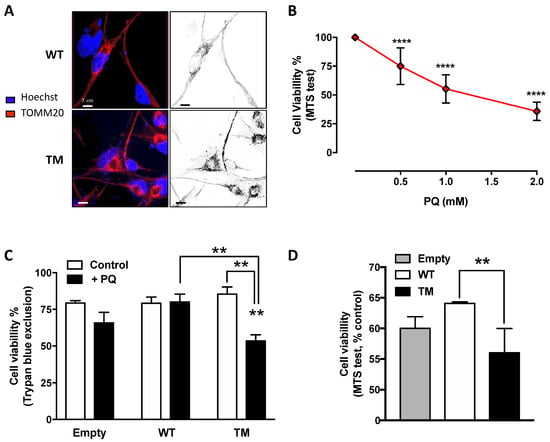 U87 cells transfected with triple mutant succinate semialdehyde dehydrogenase (TM SSADH) (TM SSADH) show mitochondrial fragmentation and increased susceptibility to the mitochondrial toxin Paraquat (PQ). (A) Mitochondrial network of untreated cells was pointed out by confocal microscopy by staining with the mitochondrial marker TOMM20 (red). Hoechst 33,342 (blue) was used to stain nuclei. Scale bar: 7 µm; (B) viability of non-transfected U87 cells was assessed by the MTS test, after 24 h treatment with increasing doses of PQ. Data are reported as percentage of cell viability of untreated cells and are shown as mean ± SD. n = 3, **** p < 0.0001; (C) viability of transiently-transfected cells was assessed by the Trypan blue exclusion test, after treatment with 1 mM PQ for 24 h (n = 3, ** p < 0.01). (D) Viability of transiently transfected cells was assessed by the MTS test, and treated as in (C) (n = 3, ** p < 0.01). Data are reported as percentage of cell viability of untreated cells and are shown as mean ± SD.