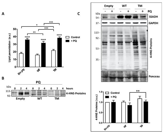 However, cells transfected with WT SSADH show a lower peroxidation level with respect to cells transfected with the empty vector; conversely, TM SSADH cells show higher level of lipid peroxides both upon PQ treatment and under basal conditions, suggesting that this mutant exerts a pro-oxidant action per se (Figure 4A). Upon lipid peroxidation, the formation of the degradation product 4-HNE occurs, and it covalently binds to proteins. After 2 or 4 h of PQ treatment, Western blot analysis, focused on the protein bands corresponding to 90–120 kDa, highlighted a significant accumulation of 4-HNE-protein adducts in cells transfected with the empty vector. Conversely, both WT SSADH and TM SSADH showed a limited accumulation of 4-HNE protein-adducts (Figure 4B). However, at longer time of PQ treatment (24 h), only cells transfected with TM SSADH show high levels of 4-HNE-protein adducts. This can be explained by previous observation that 4-HNE-protein adducts undergo removal within few hours [9]; however, the activity of TM SSADH is not sufficient to eliminate 4-HNE and the high level of protein adducts persists (Figure 4C).
