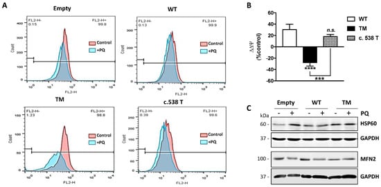 In order to better substantiate mitochondrial damage, we assessed protein levels of HSP60 and MFN2, which represent molecular markers of mitochondrial stress [13,14,15] and dynamics (fission/fusion), respectively (Figure 5C). Western blot analysis revealed that under resting conditions, the levels of Hsp60 in TM SSADH cells were greater with respect to control and WT SSADH cells and were maintained at high levels upon PQ treatment. By analyzing the protein levels of MFN2, which is implicated in mitochondrial fusion, we found that it was decreased in TM SSADH cells compared to both control and WT SSADH cells, confirming the occurrence of mitochondrial fragmentation under resting conditions. Upon PQ treatment, while MFN2 levels were reduced both in control and WT SSADH cells, in TM SSADH cells MFN2 levels remained unaltered, arguing that a maximum degree of mitochondrial fragmentation was already established upon TM SSADH overexpression.