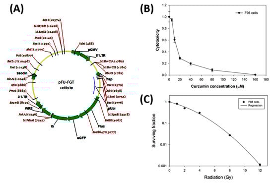 Lentiviral-based trifusion reporter vector, cytotoxicity of curcumin on F98 glioblastoma cells, and radiation survival curve of F98 glioblastoma cells. (A) The gene map of constructed lentiviral-based trifusion reporter vector. FGT: F stands for Fluc: firefly luciferase; G stands for eGFP: enhanced green fluorescent protein; T stands for tk: thymidine kinase. pUbi: ubiquitin promoter; LTR: long terminal repeat. (B) F98 cells were treated with various concentrations of curcumin (0–160 µM) for 24 h and determined with MTT assay. IC50 is about 15 µM. (C) F98 cells were irradiated with 0–12 Gy of X-ray, and surviving fractions were assayed by colony formation. D10 is about 6 Gy.
