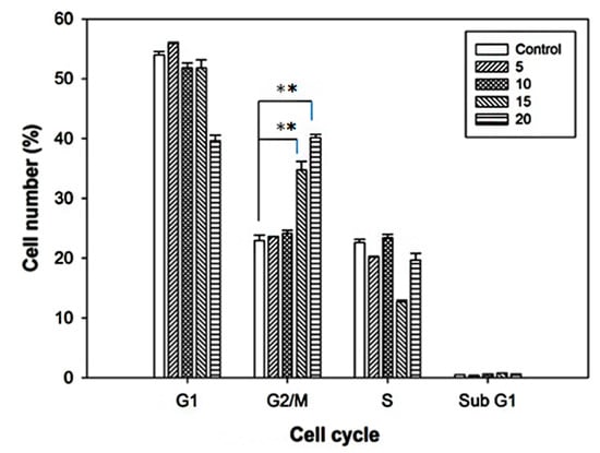 Cell cycle analysis of F98 cells treated with curcumin. F98 cells are treated with various concentrations of curcumin (0, 5, 10, 15, and 20 µM) for 24 h, and then assayed with flow cytometer. The cells were arrested significantly at G2/M phases. ** p < 0.01.
