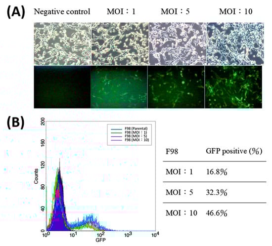 The transfected F98 cells were observed by a fluoroscopy microscope, and the MOI-1, -5, and -10 (multiplicity of infection) patching conditions did not cause any significant change of cell morphology (Figure 3A). It can be seen that as the virus concentration is higher, the brightness of green fluorescent light and the proportion of bright cells are higher. The ratio of green fluorescence is quantified by flow cytometry, showing the proportions of GFP-positive cells for MOI-1, -5, and -10 as 16.8%, 32.3%, and 46.6%, respectively (Figure 3B).