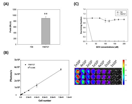 4.3. Assay of Luciferase Activity of F98/FGT Cells