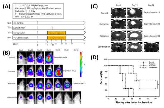 Therapeutic efficacy evaluation of curcumin, radiation, and combination of both in F98/FGT glioblastoma-bearing rat model using multimodalities of molecular imaging. (A) The experimental design and protocol. (B) The tumor growth inhibition was monitored by bioluminescent imaging (BLI) using Xenogen IVIS-50 system. No BLI was found on day 20 and thereafter in combination group. (C) The tumor growth inhibition was monitored with a 3T MRI instrument. (D) The Kaplan–Meier survival curves of animal study. The survival periods were 26 days and 32 days for the control and curcumin alone, respectively. About one-fifth and half of rats survived more than 60 days in the radiation group and combination group, respectively. Notably, a significance in survival was found between these two groups (* p < 0.05). The experiments were repeated twice and one out of two is shown here.
