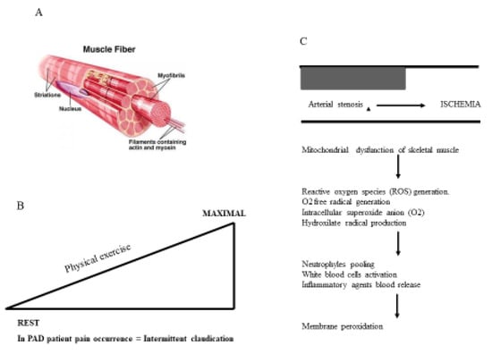 Arterial stenosis caused by atherosclerotic plaque build-up in peripheral arteries is crucial in determining the hemodynamic disturbance of the arterial flow of peripheral circulation. Hemodynamic peripheral disturbance is paramount in provoking severe damage to skeletal muscle in patients suffering from PAD [30,31,32,33,34,35]. Moreover, PAD patients demonstrated either low or high grades of inflammation, and active OxS [36,37,38,39,40], which are two pathophysiological mechanisms in PAD. The hemodynamic disturbance of peripheral circulation in PAD characterizes the chronic ischemia, which in turn damages the myofibers of the lower limb skeletal muscles. Differences in hematic loads varying with muscle tissue need (ischemia) is crucial in causing intermittent claudication (walking pain) which is the major clinical symptom in PAD patients. Repeated episodes of ischemia lead to progressive and severe damage to skeletal musculature and the dysfunction of skeletal muscle cell mitochondria [41]. Findings from the muscle biopsies of PAD patients showed great muscle-cell apoptosis and reduced type-I myofiber, both of which may interfere with muscle performance [42,43]. Mitochondrial dysfunction of skeletal muscle cells contributes to impaired muscle metabolism in PAD. High circulating and muscle levels of the intermediates of oxidative phosphorylation, including acyl carnitines, found in PAD patients, suggested lowered mitochondrial metabolism [44]. The mitochondrial mass of skeletal muscle in PAD is higher and, by contrast, there is lower activity of mitochondrial complexes impeding ATP generation, and enhancing ROS generation. Altered mitochondrial function restricts oxygen utilization and it may bring endothelial dysfunction because mitochondrial-derived oxidants reduce nitric-oxide bioactivity [45,46]. Muscle myofibers degeneration is associated with the OxS generation, including carbonyl groups, 4-hydroxy-2-nonenal adducts and protein modifications produced by ROS [47]. Active mitochondrial capability is important in angiogenesis because it is consistent with the notion of coupling vascular and muscular parameters. In hind limb ischemia models, peroxisome proliferator-activated receptor gamma coactivator 1-alpha (PGC-1a), a key regulator of mitochondrial biogenesis, promotes vascular regeneration [48]. Skeletal muscle dysfunction, including mitochondrial abnormalities, affects walking ability in PAD. Both decreased calf muscle content and altered fiber type relate to reduced functional parameters. Importantly, mitochondrial dysfunction assessed by magnetic resonance spectroscopy to evaluate phosphocreatine recovery is associated with lower treadmill walking times. PAD patients with greater amounts of muscle acyl carnitine accumulation have greater degrees of exercise limitation. Evidence of myofiber damage is associated with both reduced walking distance and muscle strength in patients with claudication. Furthermore, the altered regulation of a cytoskeletal protein, desmin, is associated with reduced mitochondrial respiratory function and functional capacity in PADs [49]. There is evidence of inadequate mitochondrial clearance through autophagy in skeletal muscles of PAD patients that in turn is associated with the walking performance, and it is also consistent with increased mitochondrial damage (Figure 1). Higher levels of daily activity are associated with healthy calf muscle parameters. Several aspects of skeletal muscle phenotype, including increased calf muscle fat and decreased muscle density, predicted a 2-year functional decline in a longitudinal study. Evidence of reduced mitochondrial biogenesis is associated with higher overall mortality, which is potentially mediated through reduced physical activity [42].