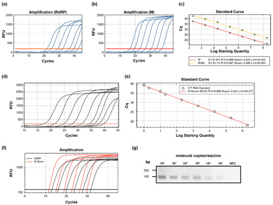 Characteristics of M-gene based qRT-PCR. (a) Representative amplification curves of WHO RdRP- and (b) SARS-CoV-2 M-gene-specific qRT-PCR using plasmid standard copy numbers. (c) Standard curves of both genes determined with plasmid templates. The Cq was plotted against the log starting quantity of the indicated plasmid DNA template. (d) Representative amplification curves and (e) standard curves of SARS-CoV-2 M-gene-specific qRT-PCR using in vitro-transcribed RNA templates. Log starting quantity (copies/reaction) is indicated and plotted against the Cq. (f) Representative amplification curves for SARS-CoV-2 M- and RdRP-gene-specific qRT-PCR using in vitro-transcribed RNA templates harboring both target sequences. (g) Distinct M-gene amplicons visualized in a 2% agarose gel. The RNA copy numbers per reaction are indicated on the top. RFU, relative fluorescence units; bp, base pairs; Cq, quantification cycle; NTC, no template control (H2O); E, amplification efficiency.