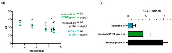 In order to validate our method, we re-tested clinically relevant samples that had been qualitatively tested as positive for SARS-CoV-2 RNA during routine diagnostics (Table S2). WHO-recommended RdRP primer pairs were used for confirmation. As negative controls, we included eight negative samples (Figure 1, Table S1). As described above, non-specific E-gene amplicons were detected in a test kit-specific manner, possibly due to the reagents used [8]. Therefore, we additionally compared the performance of two research kits (New England Biolabs, Ipswich, MA, USA) and one in vitro diagnostic (IVD) certified test kit (Roche Viral Multiplex RNA Kit) using M-gene and RdRP-gene primers. Overall, we observed lower Cq values with all three kits for the M-gene when compared to the RdRP-gene PCR (Figure 3. Using the Luna OneStep Probe kit (Luna Universal Probe One-Step RT-qPCR Kit, NEB), the M-gene PCR was significantly more sensitive with all the tested kits, with a difference of approximately 10 Cq values with the Luna Universal Probe One-Step RT-qPCR Kit in comparison to PCR with the RdRP-specific primer pairs. With the SYBR green-based kit (Luna Universal One-Step RT-qPCR Kit) and Roche IVT kit (LightCycler® Multiplex RNA Virus Master), we observed four and one Cq value difference(s), respectively, confirming that the detection of the M-gene is superior to the RdRP-gene PCR.