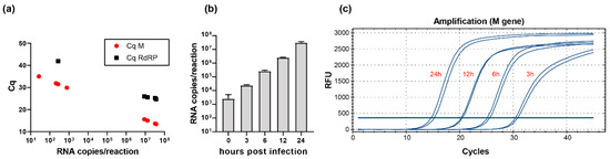 To further evaluate whether the newly developed method is also suitable for the detection of intracellular virus RNA, we infected Vero and Caco-2 cells with SARS-CoV-2 isolate FFM1 (MT358638). Using M-gene PCR, we were able to detect very low copy numbers of viral RNA in infected Vero cells, while RdRP-gene PCR was limited in sensitivity (Figure 4a). Furthermore, we infected Caco-2 cells, generated an intracellular replication curve, and monitored viral replication and genome copy numbers, respectively. Viral RNA was detectable at the time points of 3, 6, 12 and 24 h post infection, with a linear trend (Figure 4b,c).