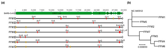 Caco-2 cells were infected with different viral isolates (FFM1-FFM7) at an MOI of 0.01. Cell culture supernatant was harvested at 48 h after infection then precleared at 2000× g for 10 min at room temperature. Virus particle-containing supernatant (20 mL) was overlaid on 25% sucrose in PBS and centrifuged at 26,000 rpm for 3 h at 4 °C using an SW28 rotor (Beckman Coulter, Brea, CA, USA). Pellets were dissolved in 500 µL of sterile PBS overnight at 4 °C. One third of the purified virions was used for RNA extraction using the Macherey Nagel Virus RNA isolation kit (Macherey Nagel, Düren, Germany) without carrier RNA, according to the manufacturer’s recommendations. The libraries were prepared and sequenced by GenXPro GmbH, Frankfurt a. M., Germany. Briefly, quality was checked on a LabChip GXII platform, and RNA-seq libraries were prepared using the NEBNext Ultra II Directional RNA-Seq kit according to the manufacturer’s recommendations. Sequencing was performed on an Illumina NextSeq 500 platform with 75 cycles. The raw sequencing reads were trimmed for adaptors and for a minimum quality of 30 and mapped to NC_045512 using Geneious mapper with default settings. The full-length sequences for each isolate can be retrieved using Genbank accession numbers MT358638–MT358643. The phylogenetic tree was inferred by using the Maximum Likelihood method and Tamura–Nei model [14] and conducted by the MEGA-X software [15].