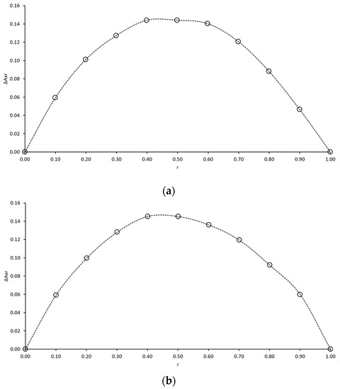 Although various studies confirm that AA forms inclusion complexes with α- and β-cyclodextrin [22,26,29], inclusion complexes between AA and γCD are yet to be verified. The phase solubility technique is well known for drug/CD inclusion complex confirmation. However, in the case of water-soluble drugs such as ascorbic acid, the major disadvantage of this technique is the preparation of saturated AA in γCD solutions. To perform phase solubility studies, saturated AA in various concentrations of γCD should be prepared; hence, a large amount of AA is required. The prepared solutions should also be placed on a horizontal shaker at a constant speed for at least three days to verify that that those solutions are saturated. Because AA is a labile compound that is easily degraded, a preparation of saturated AA in γCD solutions may not be a suitable option. Therefore, the continuous variation technique was proposed. Furthermore, Karim and coworkers [30] demonstrated that PVA can encapsulate AA into its structure so that the formation of AA/PVA complexes could be verified. Considering the maximum of the curve on Job’s plots (Figure 1), the AA/γCD and AA/PVA complexes were confirmed and demonstrated a symmetrical shape with a maximum at r = 0.5 that represented the formation of an equimolar complex (i.e., 1:1, 2:2 or higher n:n, within the investigated concentration range).