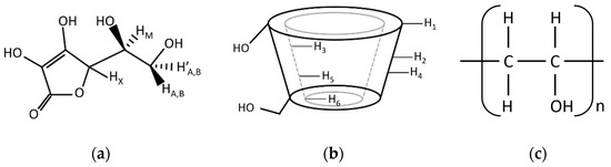 Stereo-chemical configuration of ascorbic acid (a), γ-cyclodextrin with internal and external protons (b), and poly(vinyl alcohol) (c).