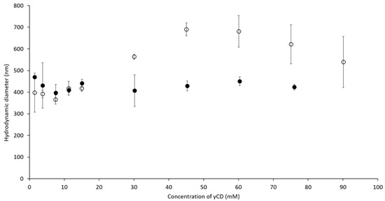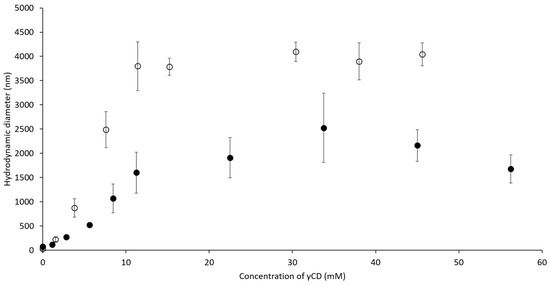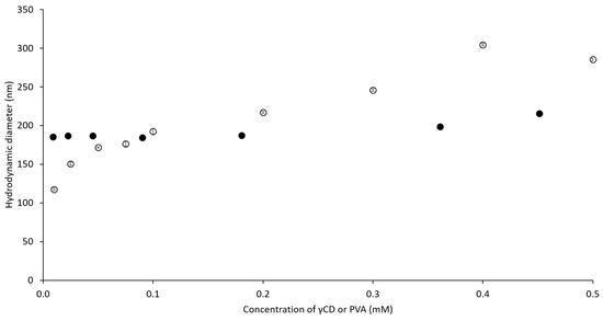Hydrodynamic diameters of γCD/PVA inclusion complexes at various concentrations of γCD (○) and PVA (●).