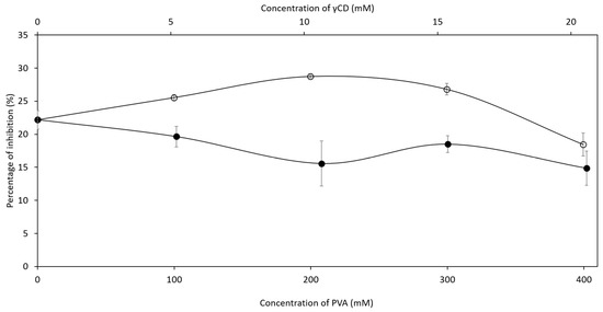 Percentage of inhibition of ascorbic acid in AA/γCD (○) and AA/PVA (●) complexes.