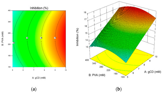 Contour (a) and surface (b) plots demonstrating relationship between γCD and PVA concentrations on percentage of inhibition.