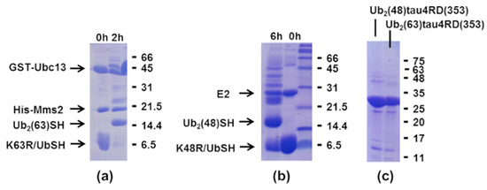 SDS-PAGE showing the enzymatic reaction to obtain the Ub2(63)-SH (a) or Ub2(48)-SH (b) di-ubiquitin molecules. In (c), the purified Ub2(48)tau4RD(353) and Ub2(63)tau4RD(353) are shown.