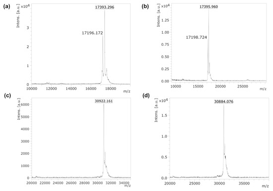 Maldi TOF MS analysis of protein samples. We obtained mass values of 17,393 and 17,396 for the Ub2(48)-S-TNB (a) and Ub2(63)-S-TNB (b) adducts, respectively (expected mass 17397), where TNB stands for (2-nitro-5-thiobenzoic acid). In (a) and (b), the MS peak of the unconjugated Ub2(48/63)SH protein is also present (expected mass 17200). We obtained mass values of 30,922 and 30,884 for the Ub2(48)tau4RD(353) (c) and Ub2(63)tau4RD(353) (d), respectively (expected mass 30923).