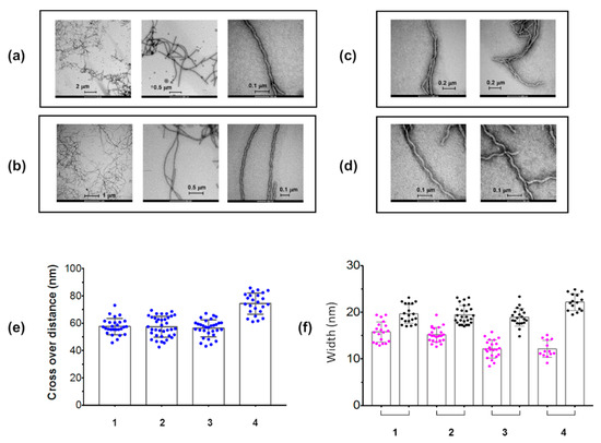 TEM representative images of (a) Ub2(48)tau4RD(353), (b) Ub2(63)tau4RD(353), (c) tau4RDΔC, and (d) Ub-tau4RD(353), after 48 h of incubation at 37 °C under static condition. 30 µL of sample at a concentration of 2.5 µM were deposited. Distributions of (e) cross-over distances and (f) widths of the twisted filaments measured from TEM images of Ub2(48)tau4RD(353) (1), Ub2(63)tau4RD(353) (2) and Ub-tau4RD(353) (3) conjugates and tau4RDΔC (4). In (e) and (f), dots indicate single measurements and bars the positions of means ± SD. In (f), dots in magenta refer to the measures of narrow widths and in black to large widths.