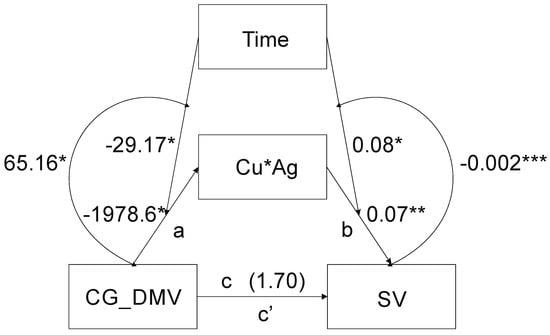 Mediation analysis including time of in vitro anther tissue cultures as a moderator of the relationship between CG_DMV and ‘Cu*Ag’ (‘a’) and between ‘Cu*Ag’ and SV (‘b’) paths where CG_DMV was an independent variable, SV was the dependent variable and ‘Cu*Ag’ a mediator shows that the model was significant (F(3,31) = 5.21, p = 0.005, R2 = 0.33) (Figure 1).