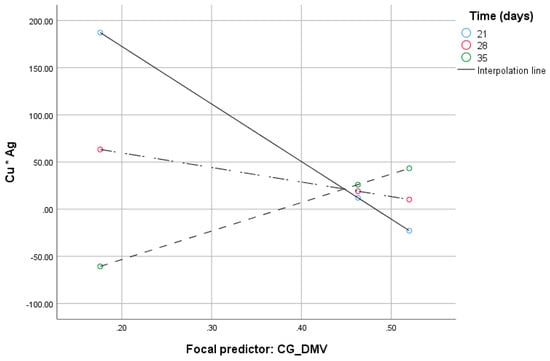 The CG_DMV variable (B = 1978.6, 95% CI [3490.00:467.2]), the time of in vitro cultures (B = 29.17, 95% CI [55.69:2.64]) and their interaction (B = 65.16, 95% CI [6.89:123.42]) were significant. The effect of the moderation beyond the main effects (the test of highest order unconditional interaction) R2chng was significant (F(1.31) = 5.2, p = 0.03) and explained 11.16% of variance due to moderation by the time. With increased CG_DMV, ‘Cu*Ag’ decreases at the lowest value of the time of in vitro tissue cultures (Figure 2). Johnson–Neyman’s statistics indicated that the conditional effect of the CG_DMV (focal predictor) at values of the time (moderator) of in vitro anther cultures was significant within the range of 21–25.9 days of in vitro tissue cultures (not shown).