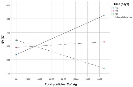 When the CG_DMV and ‘Cu*Ag’ (the mediator) were considered simultaneously, the model was significant (F(4.30) = 101.55, p < 0.0001, R2 = 0.9312), whereas path c was not (B = 1.7, 95% CI [–0.43:3.44])); however, that of path b was (B = 0.07, 95% CI [0.056:0.083]). The time of in vitro anther cultures (B = 0.08, 95% CI [0.012:0.14]), the interaction of the ‘Cu*Ag’ and the time (B = –0.002, 95% CI [–0.003:–0.0018]) were also significant as indicated by the 95% bootstrap confidence intervals. The highest order unconditional interaction between ‘Cu*Ag’ and the time was significant (F(1.30) = 73.91, p < 0.001). Up to 16.94% (R2chang = 0.1694) of variance beyond the main effect was due to the moderation by the time. With increased ‘Cu*Ag’ values, SV increases at the lowest value of time for the in vitro tissue cultures (Figure 3). Johnson and Neyman’s statistics indicated that moderation by the time was significant up to 27.7 days of in vitro tissue cultures (not shown).