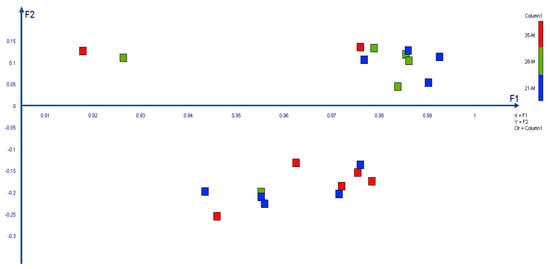 Principal Component Analysis based on metAFLP marker data showed that the first component explained 95.2% of the variation, whereas the other 2.1% (Table 2). Cronbach’s alpha equals 0.999. The regenerants formed two groups of data. The first one consists mainly of 28 and 21 days of tissue culture regenerants, whereas the second group of those after 28 and 35 days (Figure 4).