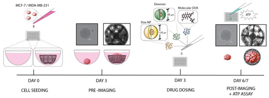 These oxygen-permeable 3D scaffolds are marketed for their ability to produce sufficient spheroid growth for (i) cell response testing, (ii) animal model transplantation, and (iii) induced cellular differentiation, all within less than 24 h. Furthermore, they are noted to be compatible with 96-well plates and require no special flow systems or media for culture. It is reported that these scaffolds can be used with over 15 primary cell types and a variety of cellular assays for numerous biological research applications [20]. While promising, it is of particular interest to explore this scaffold and culturing technique for use with breast cancer cell lines. Using small spheroids as a comparative baseline, ultra-large breast cancer tumor spheroids were cultured and subjected to chemotherapeutic dosing of DOX, DoxovesTM, and Dox-NPⓇ. Evaluation of spheroid size and cellular activity with respect to treatment versus control allowed for the illustration of the compatibility and limitations of the ultra-large scaffold model. This process is illustrated in Figure 2.