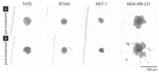 Breast cancer cell line aggregate test spheroids (A) 24 h post-cell seeding and (B) 96 h post-DOX treatment (5 μM), taken at 5x objective.