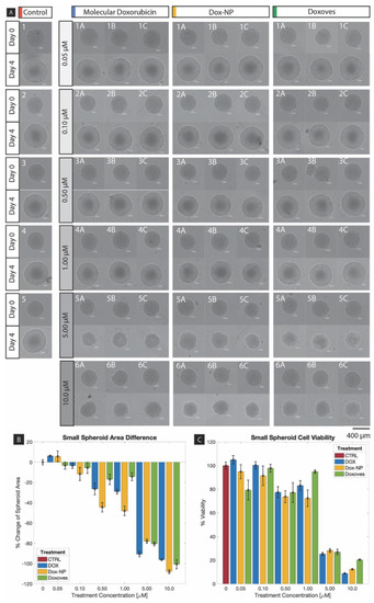 Small spheroid images were captured under a 10x objective lens using the Keyence Fluorescence All-in-One Microscope (Itasca, IL, USA). Pre-treatment images (Day 0) were taken per well, followed directly by application of 100 μL of the pre-determined concentrations of DOX, Dox-NPⓇ, and DoxovesTM to their pre-assigned position. Cultures were returned to incubation at 37 °C for four days. On Day 4 (>96 h), post-treatment images were then taken under identical settings.