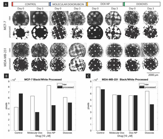 Similar to the above study of small spheroids (~500 µm), several experiments were conducted on ultra-large spheroids (~2000 µm) to investigate their viability as a chemotherapeutic testing platform based on spheroid size, ATP activity, and overall morphology. The breast cancer cell lines used in this study were MCF-7 and MDA-MB-231. Scaffolds were generated from a nozzle-free, ultra-high-resolution printer, manufactured by Prellis Biologics, Inc. (Hayward, CA, USA). For this component of the study, 78 ultra-large scaffolds (~2000 µm) were prepared and seeded with each cell line (MCF-7: 36 scaffolds, 3 controls; MDA-MB-231: 36 scaffolds, 3 controls) for culture over an incubation period of three days to study drug concentration effects on ultra-large tumor spheroids. These scaffolds were then treated with the three DOX formulations: molecular DOX, Dox-NPⓇ, and DoxovesTM (at four concentrations at 0.05 µM, 0.5 µM, 5 µM, and 50 µM). Figure 5A shows results of the raw brightfield images observed for pre- (Day 0) and post- (Day 3) treatment at 50 µM with the aforementioned drug treatment groups versus a control, and their corresponding binary processed images (via ImageJ) for quantification. These raw images were captured immediately prior to treatment of the spheroids with drugs (i.e., Day 0), followed by a 72 h exposure to treatment, and immediately before viability assay (i.e., Day 3) in order to understand drug–spheroid interaction and progression of ultra-large tumor spheroid models.