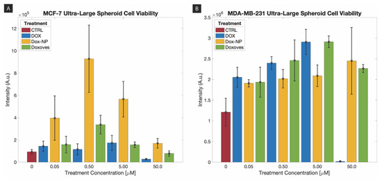 Using Figure 6, luminescence readings can be compared (i) within a single drug concentration across the four treatment groups, (ii) between the two cell line populations for the same drug concentration exposure, and (iii) across all four drug concentrations for a given cell line for the treatment groups. For example, with regards to (i), in Figure 6A, control and treatment groups for 0.05 µM were tested on three replicates. Dox-NPⓇ treatment exhibits highest luminescence as compared to control, molecular DOX and DoxovesTM treatment. The luminescence for treated spheroids is generally higher than the control; to note, this should not be the case for an effective assay. Ideally, the control group should represent the highest number of cells, and thus the highest arbitrary luminescence reading for viability. This drawback did not occur with the small spheroids, and therefore, may suggest that this may not be an effective method for rapidly assessing the viability for ultra-large spheroids, but only small spheroids. Now let us consider (ii) with Figure 8A,E (i.e., MCF-7 0.05 µM and MDA-MB-231 0.05 µM). The control groups for both cell types have similar readings, as do the molecular DOX and DoxovesTM treatment groups; Dox-NPⓇ treatment has consistently higher luminescence for MCF-7 cell types, whereas it is difficult to claim if any particular treatment group is superior in the MDA-MB-231 cell type. Finally, let us take Figure 8A–D as an example for (iii), luminescence readings for MCF-7 ultra-large spheroids under the three treatment groups and a control group at the four drug concentrations (0.05 µM, 0.5 µM, 5 µM, and 50 µM). We can observe here that all triplicates of the MCF-7 sample follow a similar trend of luminescence readings compared to any other treatment group. Overall, triplicates for Dox-NPⓇ for MCF-7 show the highest luminescence readings consistently throughout all concentrations for MCF-7 samples. Therefore, according to Figure 6, a standard interpretation of the luminescence readings would indicate that Dox-NPⓇ has the least inhibitive activity out of the treatments used for MCF-7 spheroids; MCF-7 cells tend to form uniform and regular spheroids, and due to these characteristics, it may contribute to the consistency in drug (and ATP reagent) results. Conversely, for MDA-MB-231 samples, all three drug treatment groups show minimal differences in effects, suggesting that due to the irregularity in MDA-MB-231 spheroid formation behavior, drug (and ATP reagent) results consistency poses difficulty.
