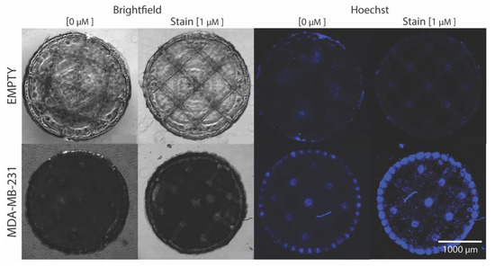 Hoechst 33,342 (Life Technologies, Eugene, OR, USA) was diluted in cell culture medium (DMEM, 10% FBS, 1.5% Pen-Strep) to a 1 µM Hoechst concentration. Cell culture medium for the 3D cell cultures were replaced with the Hoechst 33,342 diluted cell culture medium in a 24-well plate and were incubated (37 °C, 5% CO2) for 15 min before imaging.