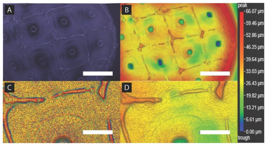 Computational analysis of MDA-MB-231 seeded scaffold surface. (A) Seeded basket true color dark field image at 5× objective (scale bar: 500 µm), (B) seeded basket colorized image for holistic/global height variation at 5× objective (scale bar: 500 µm), (C) seeded basket colorized image for localized height variation at 85% digital zoom and 5× objective (scale bar: 150 µm), (D) seeded basket colorized image for holistic height variation at 85% digital zoom and 5× objective (scale bar: 150 µm).